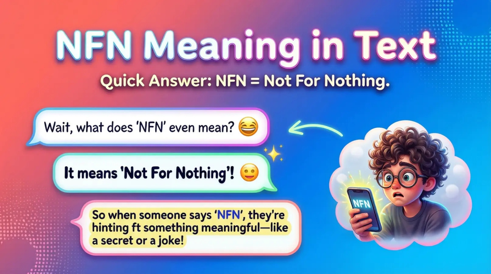 Understanding slang like NFN meaning in text can make your digital conversations feel much smoother and more relatable. Whether you’re replying to a friend on WhatsApp, leaving a comment on TikTok, or chatting in a gaming group, knowing that NFN = Not For Nothing helps you express your opinion in a friendly, casual way without sounding pushy.